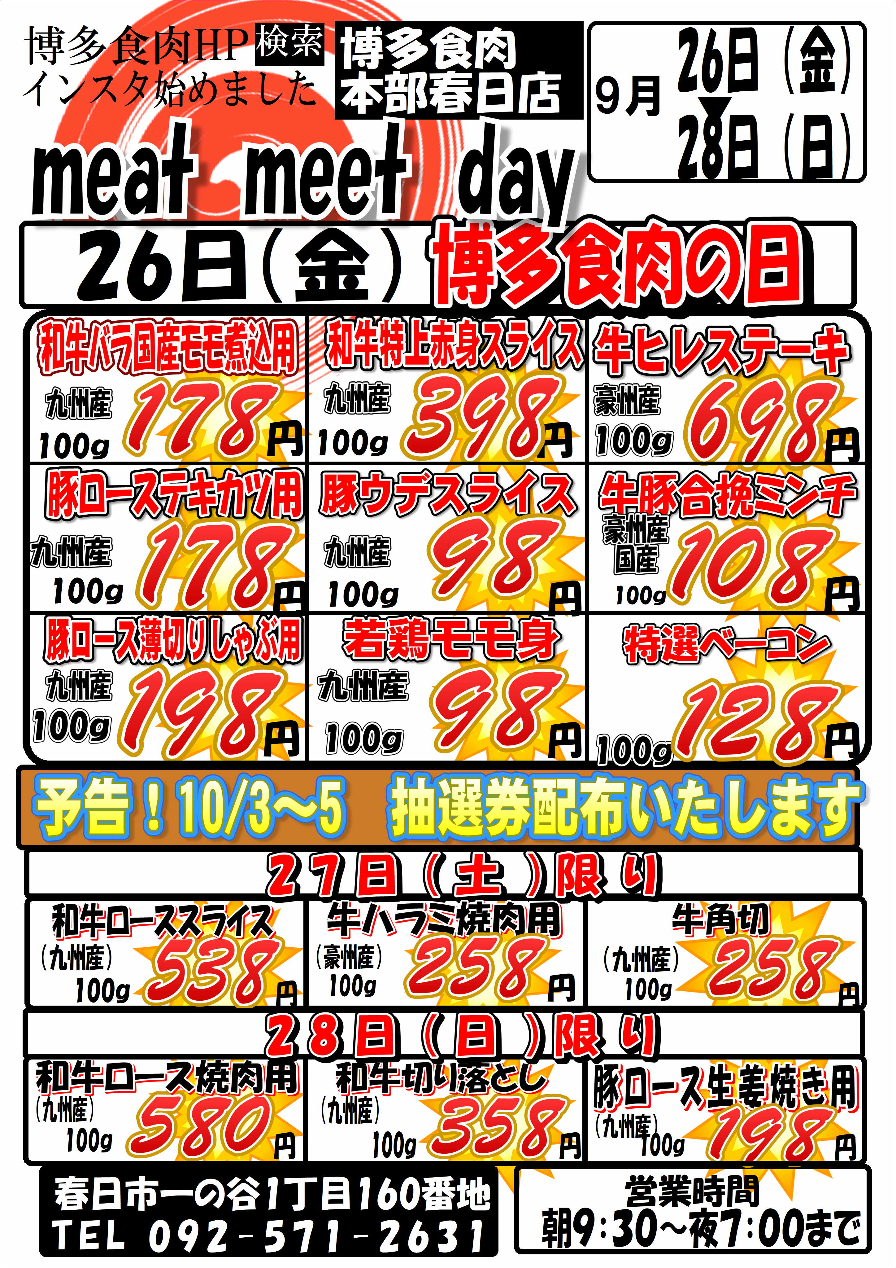 博多食肉の日を開催いたします。 皆様のご来店心よりおまちしております 予告‼ 10月3日~5日間抽選券の配布をいたします。 博多食肉のお買物券が抽選で当たりますのでこうご期待!