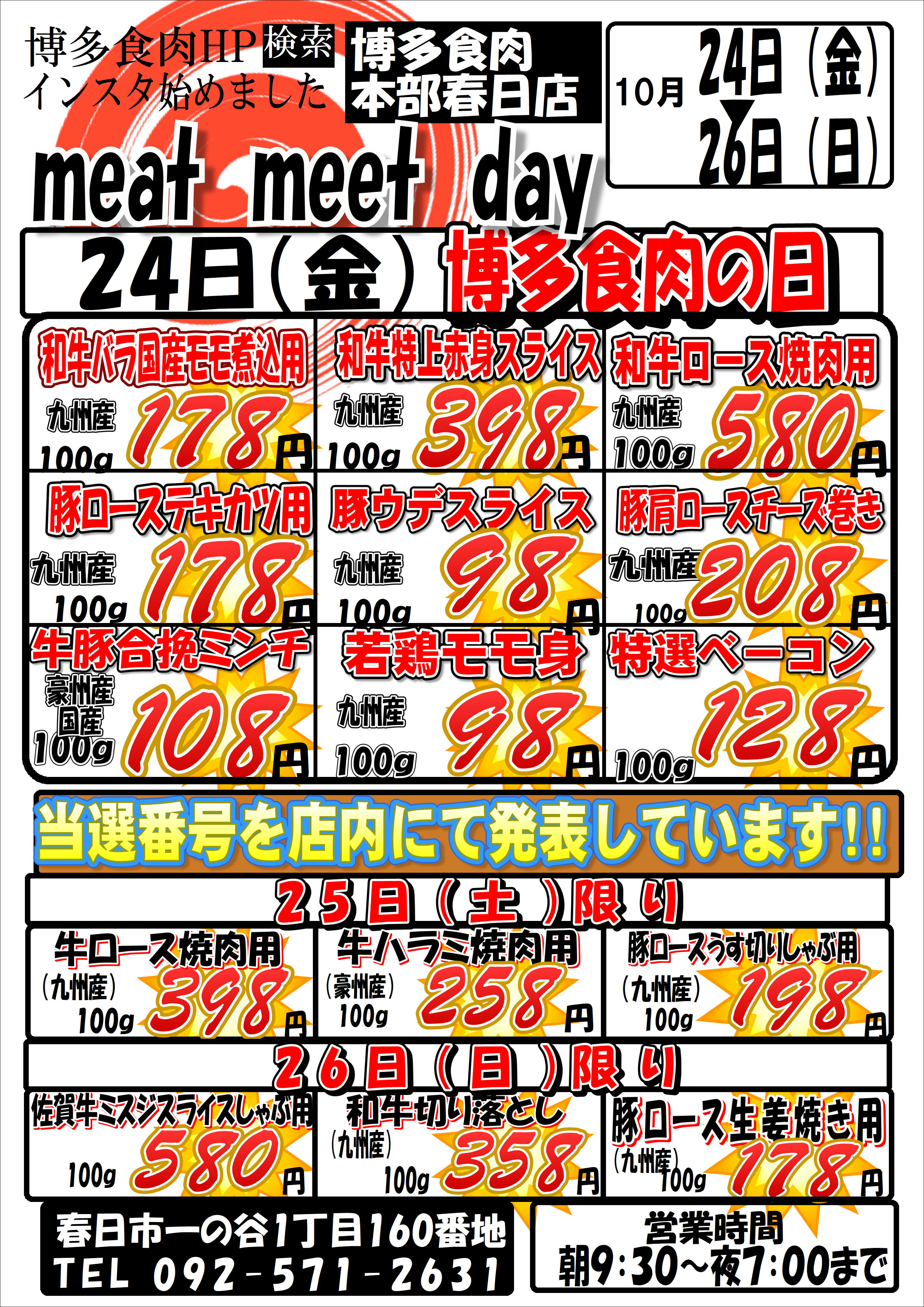 今週は博多食肉の日‼ 美味しいお肉が最もお買い得な3日間となっております この機会にたくさんの方に美味しいお肉を手に取っていただけたら幸いです!! ご来店お待ちしております 春日本部