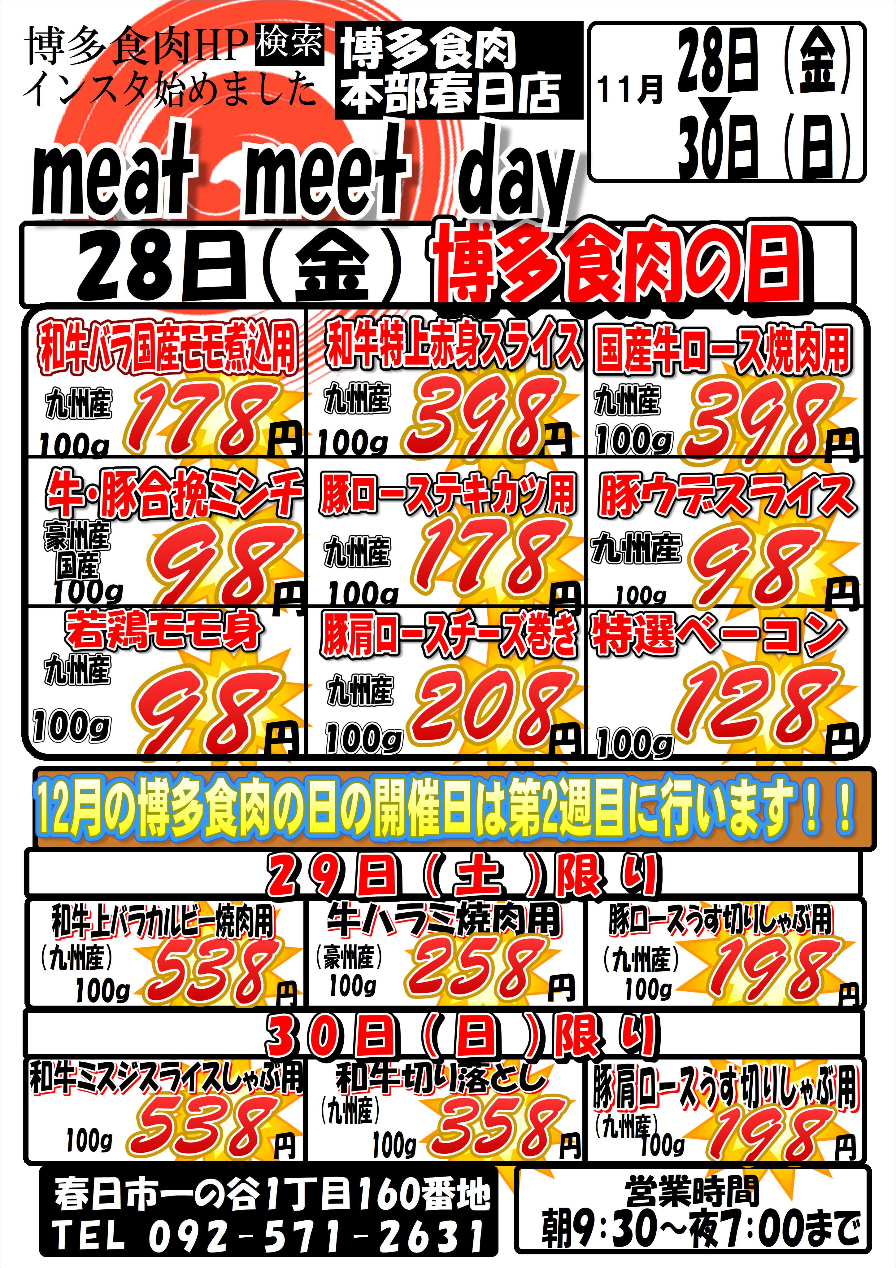 今週は月に1度の博多食肉の日の開催です‼ 美味しいお肉がお買い得になっております。 ~お知らせ~ 来月12月の博多食肉の日の開催は年末の関係もあり 第2週目(12月12日(金)~12月14日(日))に行いことになりました。 大変申し訳ございません。ご理解の程宜しくお願い致します。 春日店本部