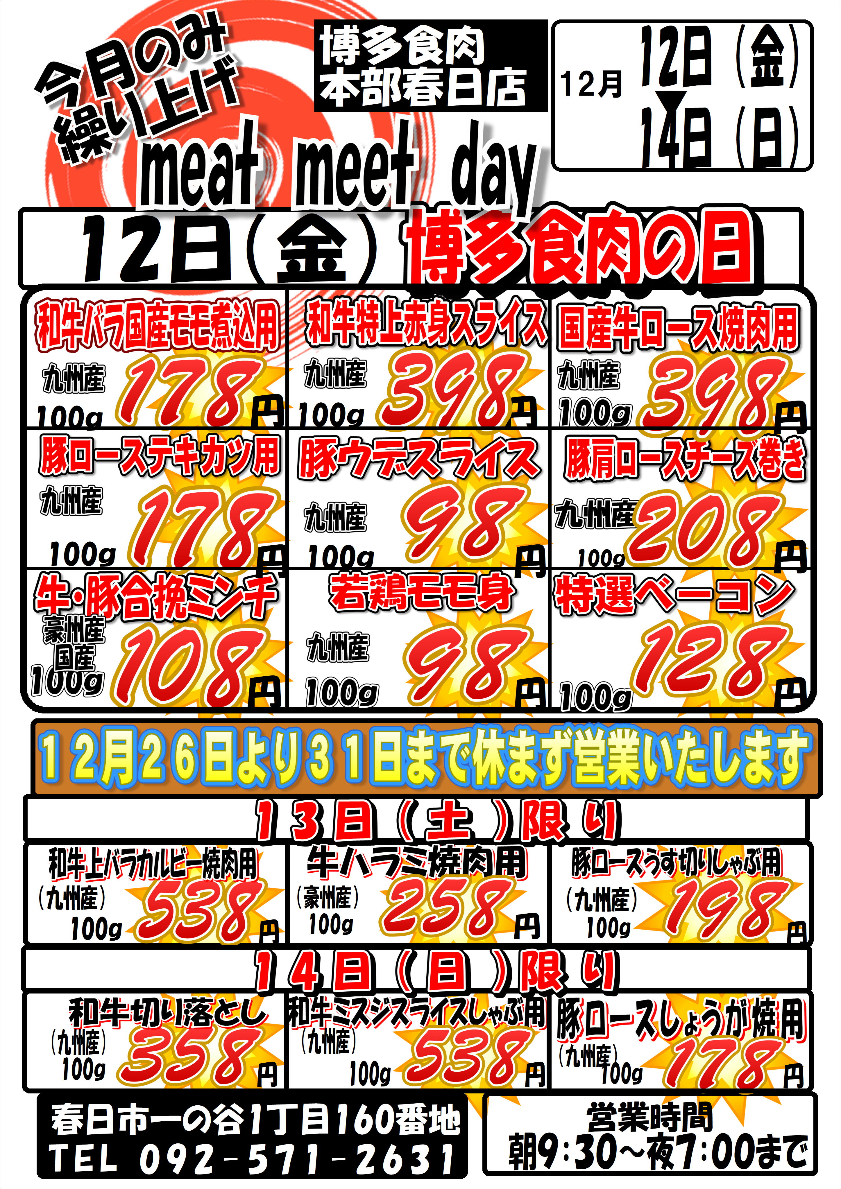 毎月恒例の博多食肉の日 今月は繰り上げての開催となっております。 今年最後の大特価‼ 皆様のご来店お待ちしております 年末は26(金)~31日(水)まで休まず営業いたします 31日は17時閉店となります 年末は混雑が予想されますので早めのご予約おまちしております。 ご注文の際はお気軽にスッタフヘお声がけください‼ 春日店本部