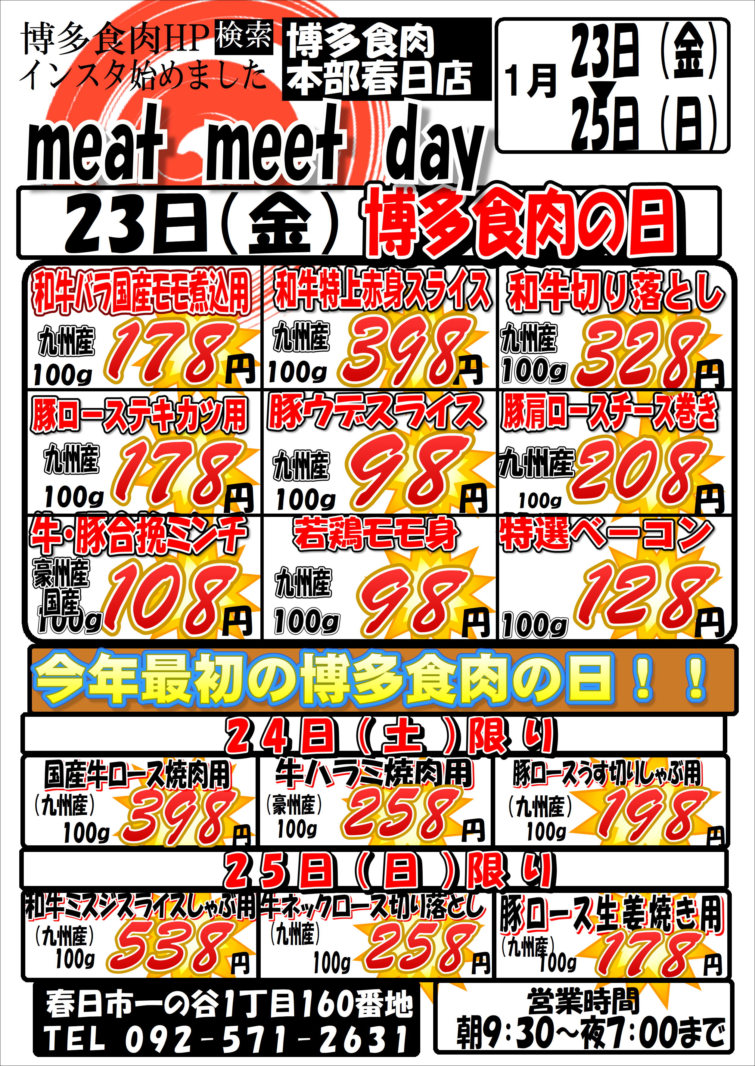今年初の博多食肉の日!! 美味しいお肉がお安くお買い求めいただけます。 是非この機会に‼ 今週も皆様のご来店お待ちしております。 春日店本部
