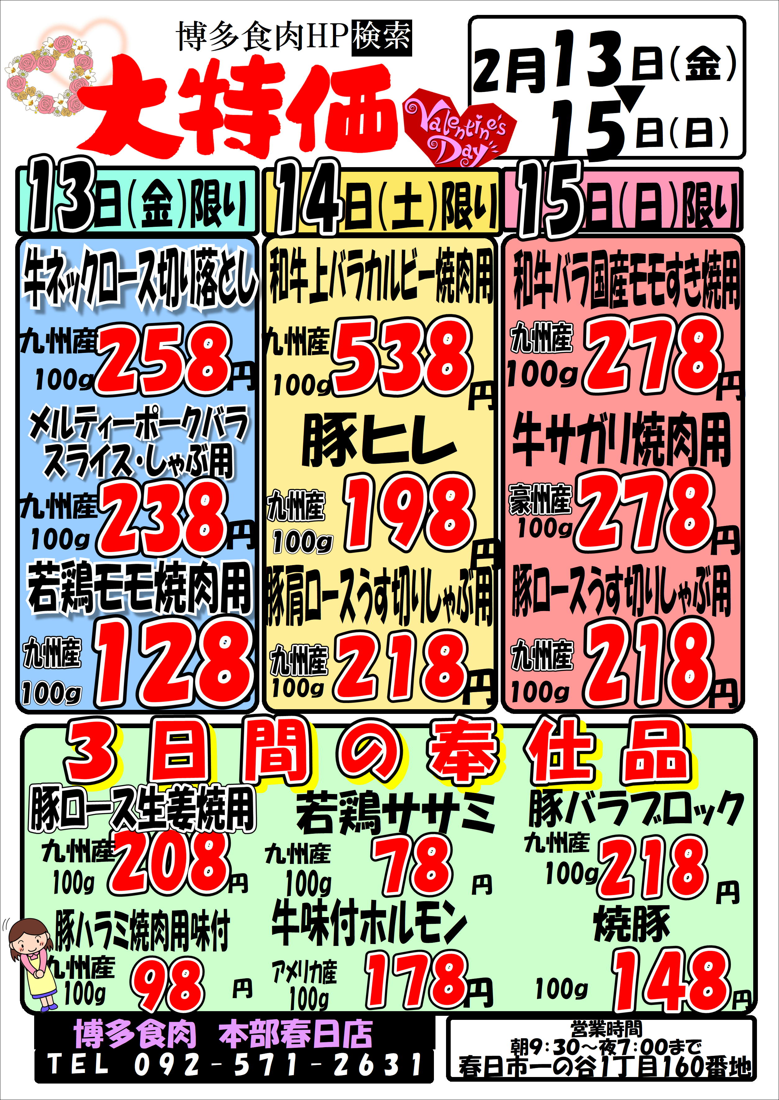 今週のチラシです。 今週土曜日はバレンタインですね。 チョコレートを使用した、お肉料理を店内で紹介してます。 是非博多食肉の美味しいお肉を使って作ってみてください!! それに加え、今週はたまごの日です‼ たまごもお安いのでぜひお買い求めください!! 春日店本部