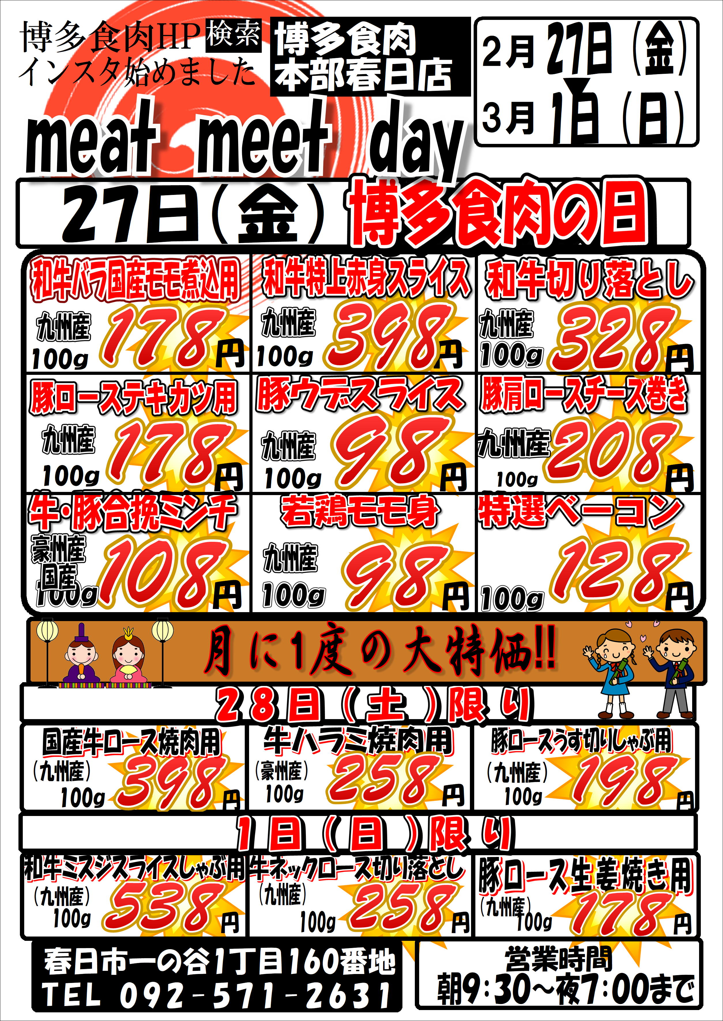 今週は月に1度の博多食肉の日‼ 大特価でご準備しております。 この機会に買いだめされてはいかがでしょうか? 今週も皆様のご来店お待ちしております‼ 春日店本部